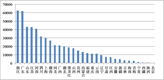 图 2:2013年各省(区、市)医疗废物产生情况(单位:吨)[6]