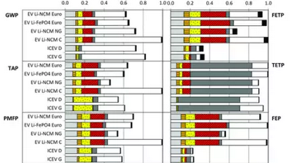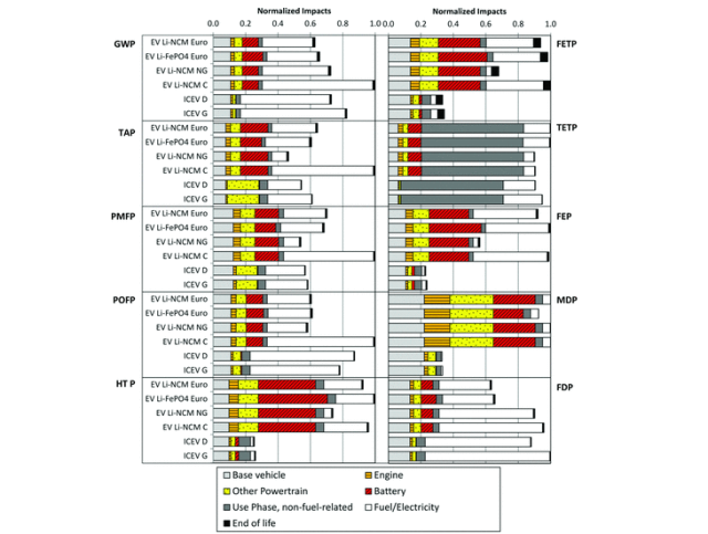 为了比较全生命周期内典型欧洲第一代电动车(EV)和常规内燃机汽车(ICEV)的环境影响,研究列出了6种汽车技术和10类全生命周期环境影响。6种不同汽车技术分别为使用欧盟平均电力(European average electricity)[3]的锂镍钴锰(LiNCM)电池和磷酸铁锂(LiFePO4)电池的电动车、使用天然气或者煤电充电的锂镍钴锰(LiNCM)电动车、和使用汽油或者柴油的内燃机汽车。10类全生命周期环境影响分别为全球变暖潜力(Global Warming Potential,GWP)、陆地酸化潜力(Terrestrial Acidification Potential,TAP)、颗粒物形成潜力(Particulate Matter Formation Potential,PMFP)、光化学氧化潜力Photochemical Oxidation Formation Potential,POFP)、人体毒性潜力(Human Toxicity Potential,HTP)、淡水生态毒性潜力(Freshwater Eco-toxicity Potential,FETP)、陆地生态毒性潜力(Terrestrial Eco-toxicity Potential,TETP)、淡水富营养化潜力(Freshwater Eutrophication Potential,FEP)、矿产资源枯竭潜力(Mineral Resource Depletion Potential,MRDP)、化石燃料资源枯竭潜力(Fossil Resource Depletion Potential,FRDP)。研究通过模型计算统一量化了环境影响的潜力[4],并建立了规范化影响(Normalized Impacts),下图横坐标0.0-1.0区域表示了规范化影响的差异。
