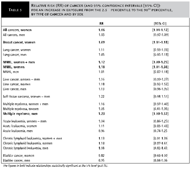 如上表所示,垃圾焚烧厂空气污染物暴露与癌症病发具有统计显著性(95%置信区间,RR>1)的癌症效应为:女性乳腺癌、恶性非霍奇金淋巴瘤和所有癌症合计,男性多发性骨髓瘤,两性合计的恶性非霍奇金淋巴瘤。而趋近具有统计显著相关性的癌症效应包括:两性合计的软组织肉瘤、肝癌、多发性骨髓瘤。