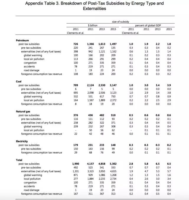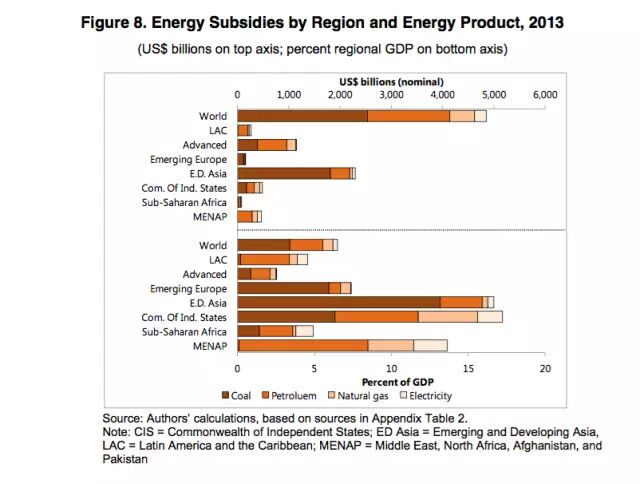 来源:Appendix Table 3,page 38, IMFWorking Paper (WP/15/105) How Large AreGlobal Energy Subsidies? 2015.https://www.imf.org/external/pubs/cat/longres.aspx?sk=42940.0