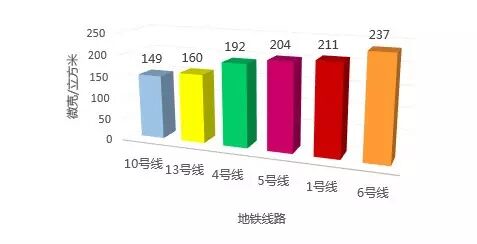 (说明:2015年8月11日早高峰时段,在全市平均PM2.5浓度超过100的情形下,我们利用Air Beam监测了北京六条主要地铁线全线单程方向车厢内空气PM2.5浓度)